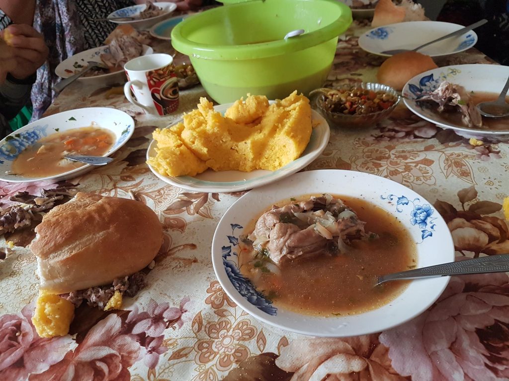 After the round of names, I start eating. The indefinable yellow stuff turns out to be maize porridge and I may eat the soup with either bread or maize porridge. I choose safe, choosing bread. Following the example of the gypsies, I tear off a piece of bread which I dip into the soup and put in my mouth. I also find the meat on my plate inconvenient with a spoon and use my hands for that too. A friendly old woman gives me a piece of kitchen paper. It is her great-grandchild sleeping next to me and I look at her again attentively. This prompts them to ask if I am married, a question translated by Jantina, who has re-entered through the creaking door. I answer in the negative and put another piece of bread in my mouth and try just one piece of maize porridge as well. The maize porridge is cooked completely dry so it doesn’t seem to truthfully bear the name “porridge”. There is little taste in it, but I imagine it is very filling! After a few more bites, I thank warmly for the food and leave the warm and cosy room through the creaky door. Time to start the club!